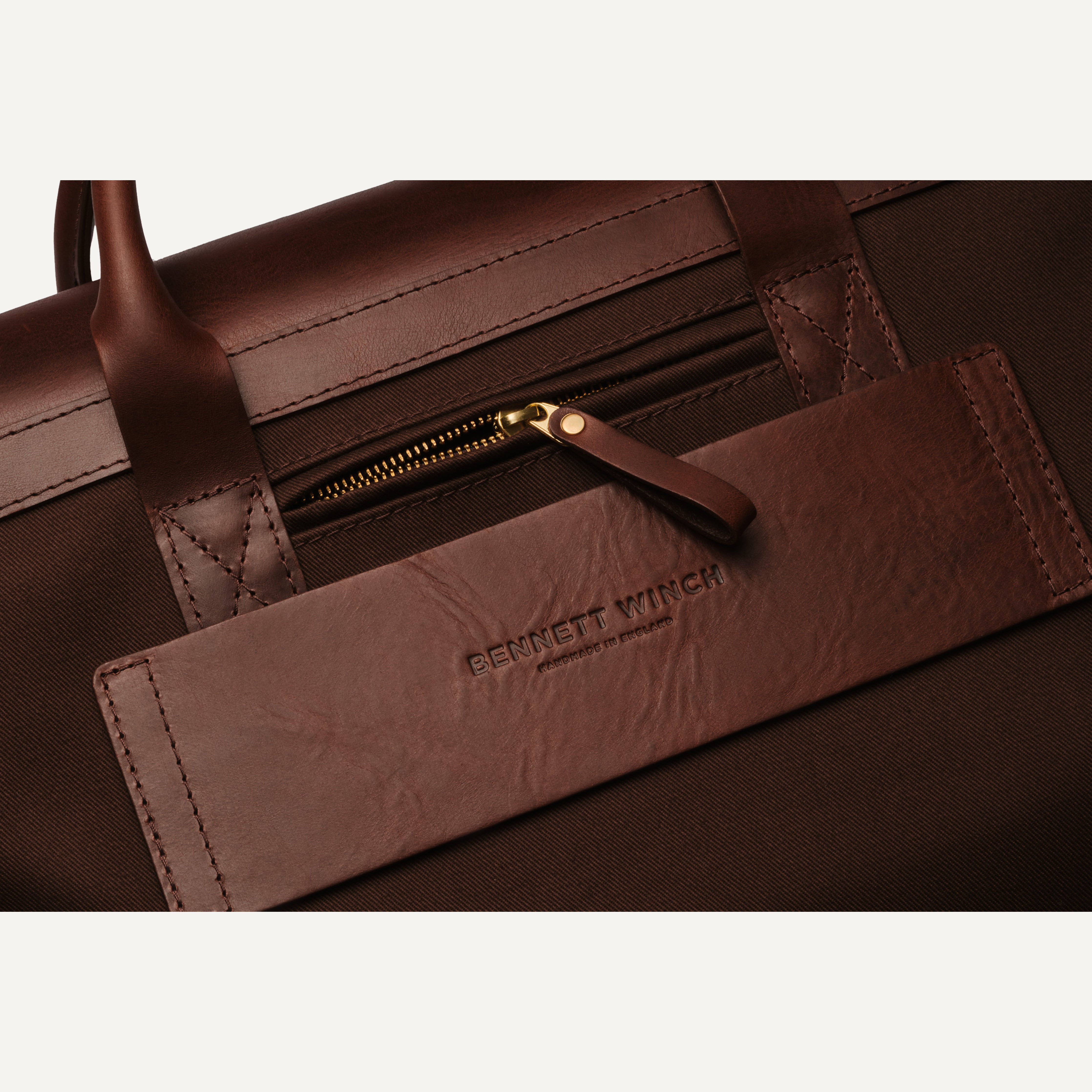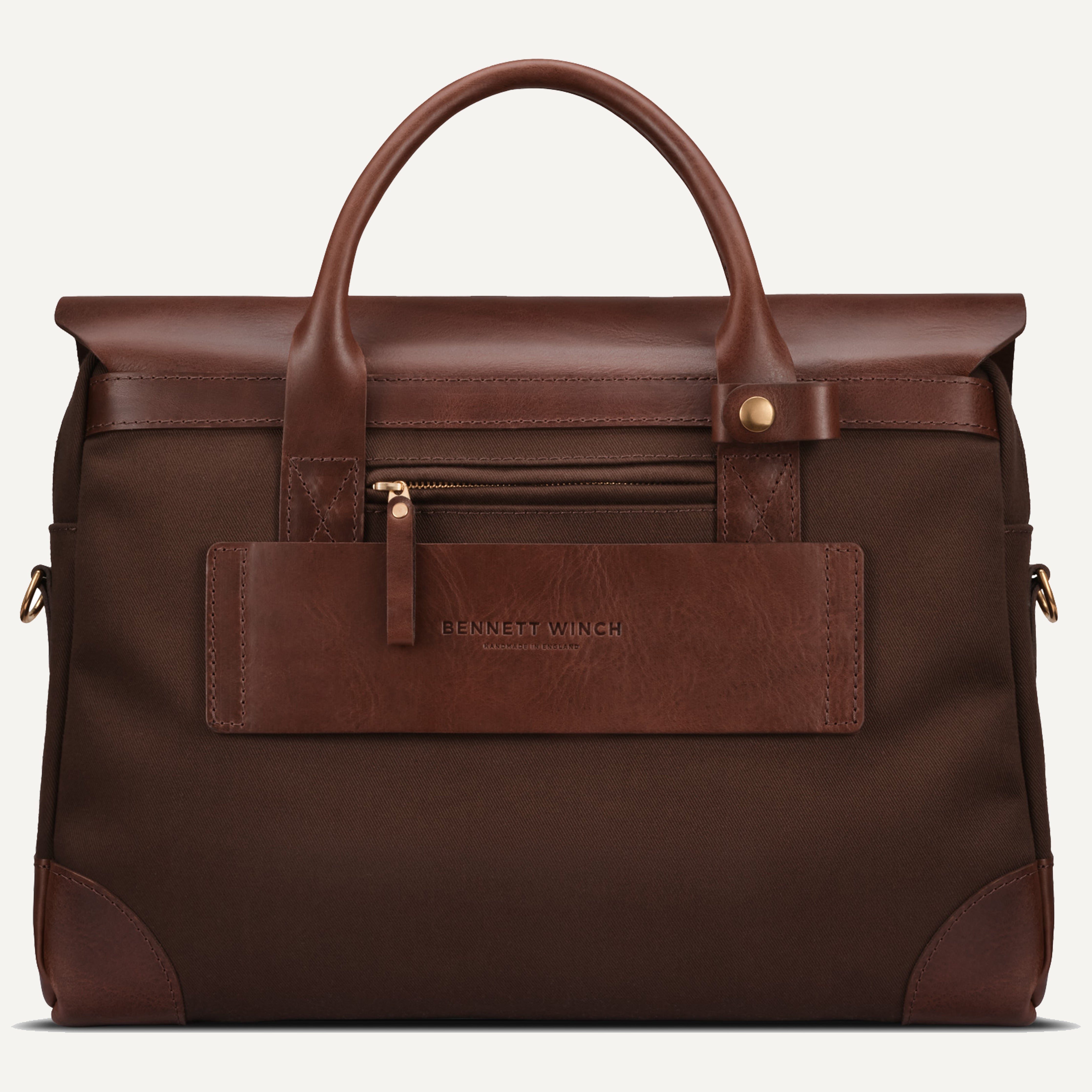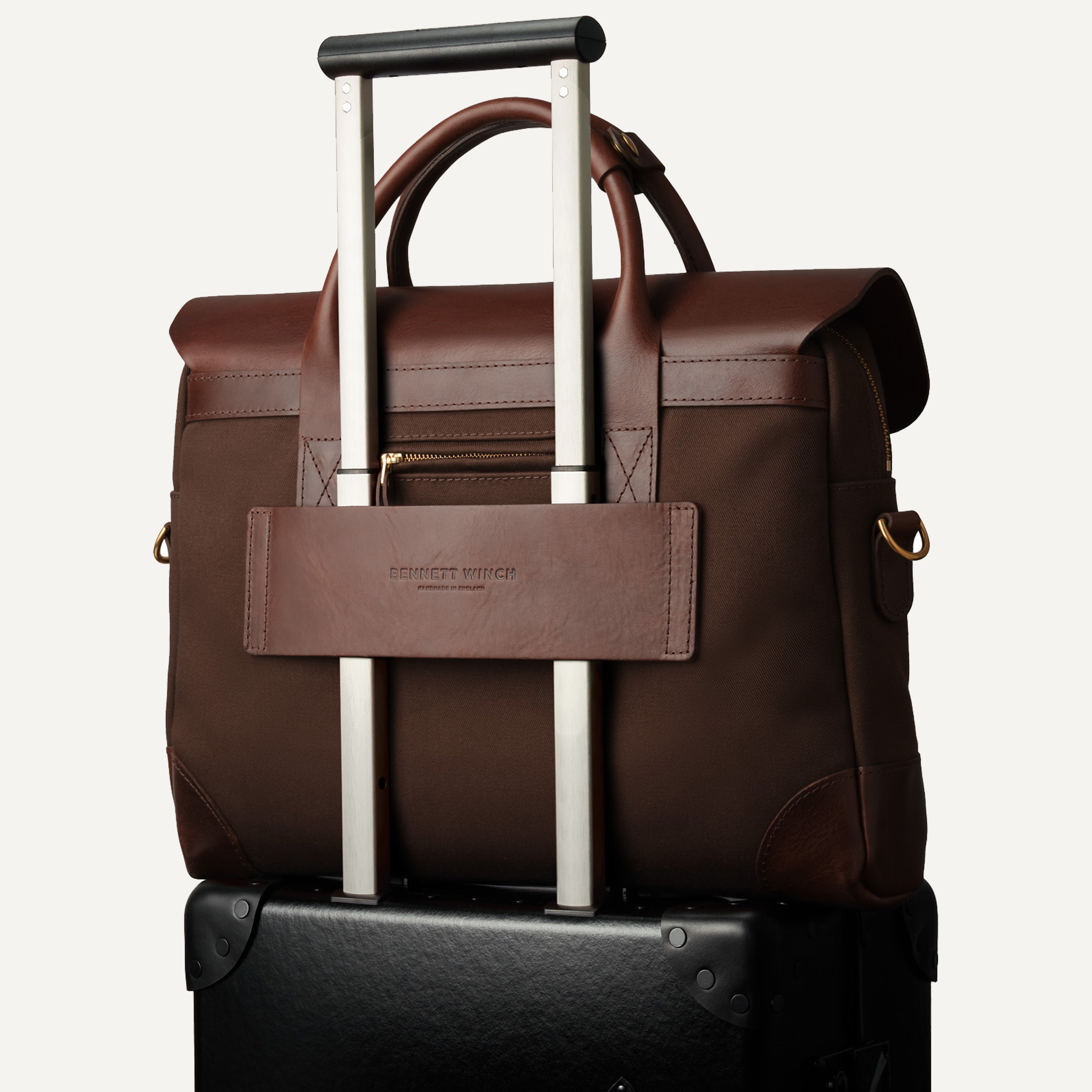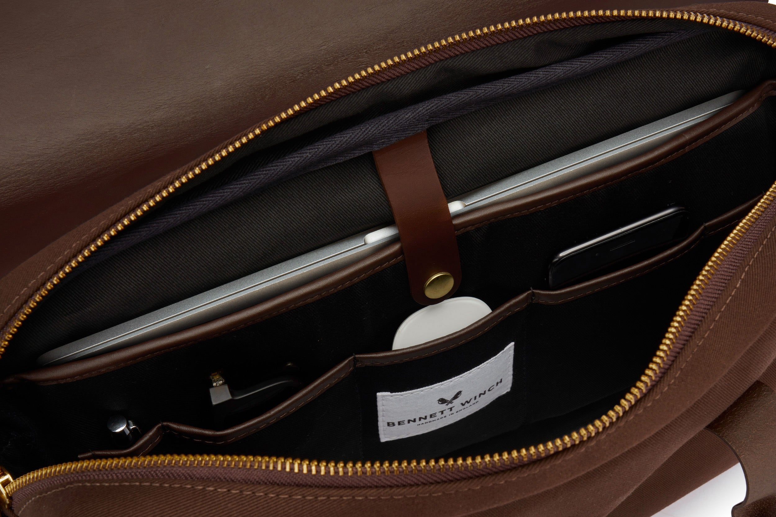 From boardrooms to laid-back member’s clubs, The Brief fits in wherever you do business. Handmade in England, the lightweight waterproof cotton canvas is matched with a leather hood and trim for a smart, understated look. The slimline design is deceptively roomy – inside you’ll find a padded laptop sleeve and internal pockets to keep cables and devices in order. A leather panel on the reverse slips over the handle of any wheeled suitcase and the external pocket has space for your phone and passport, making it the perfect traveling companion. A detachable shoulder strap offers a more casual look, or carry it by hand for a formal approach. The Brief is the epitome of modern business style and functionality.