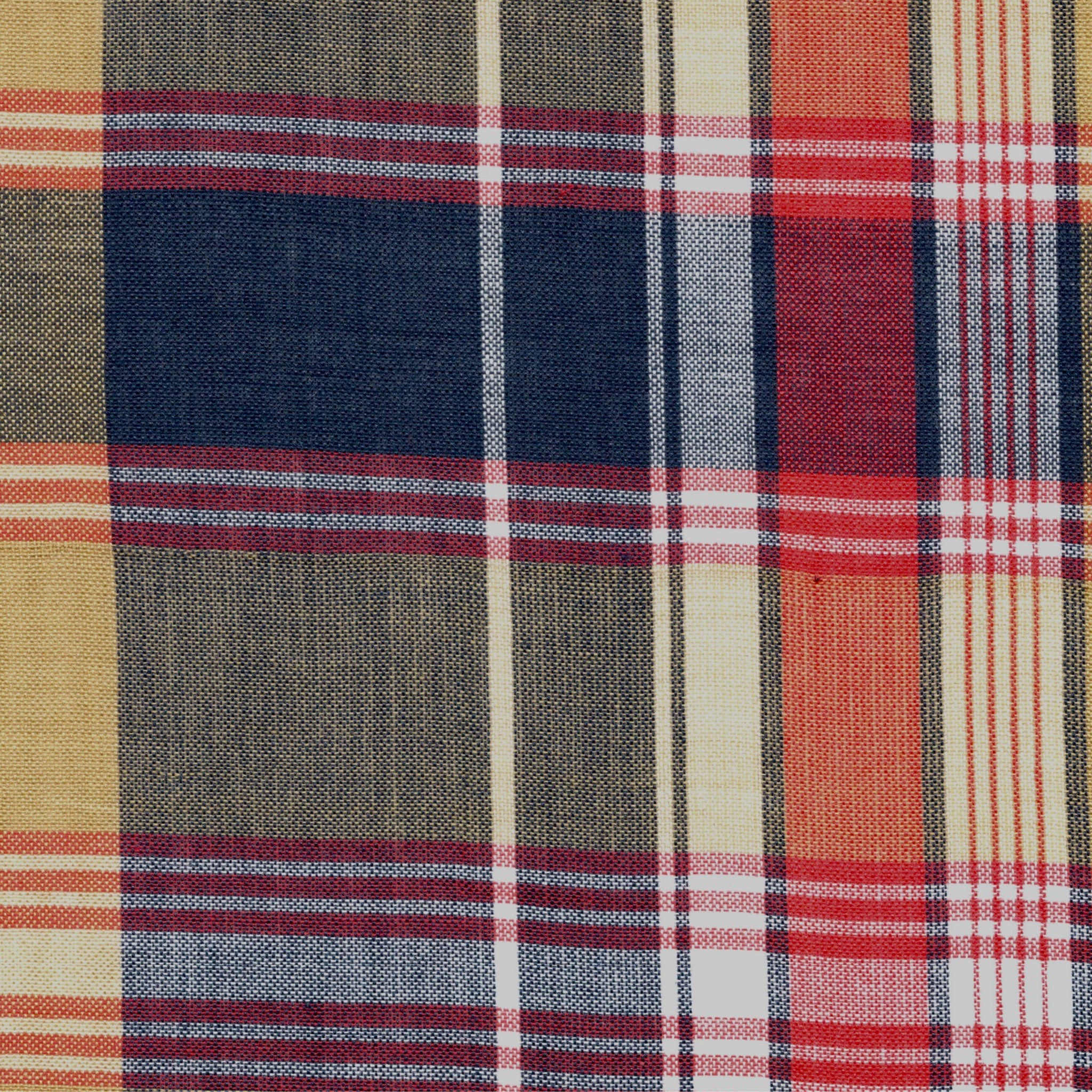 100% Cotton, Bleeding Madras. Hand wash separately cold then line dry for at least the first 6 launderings. Or, Dry Clean.