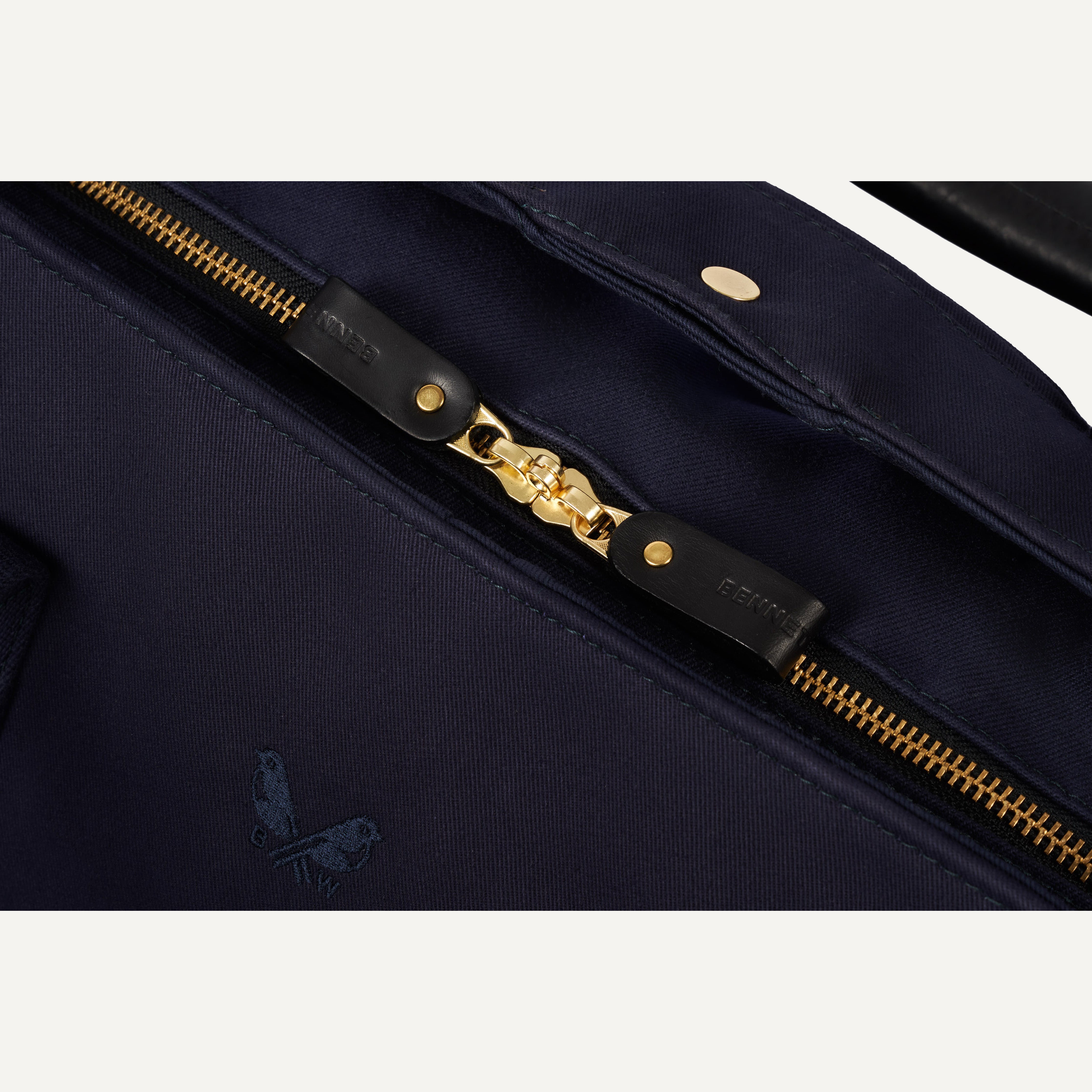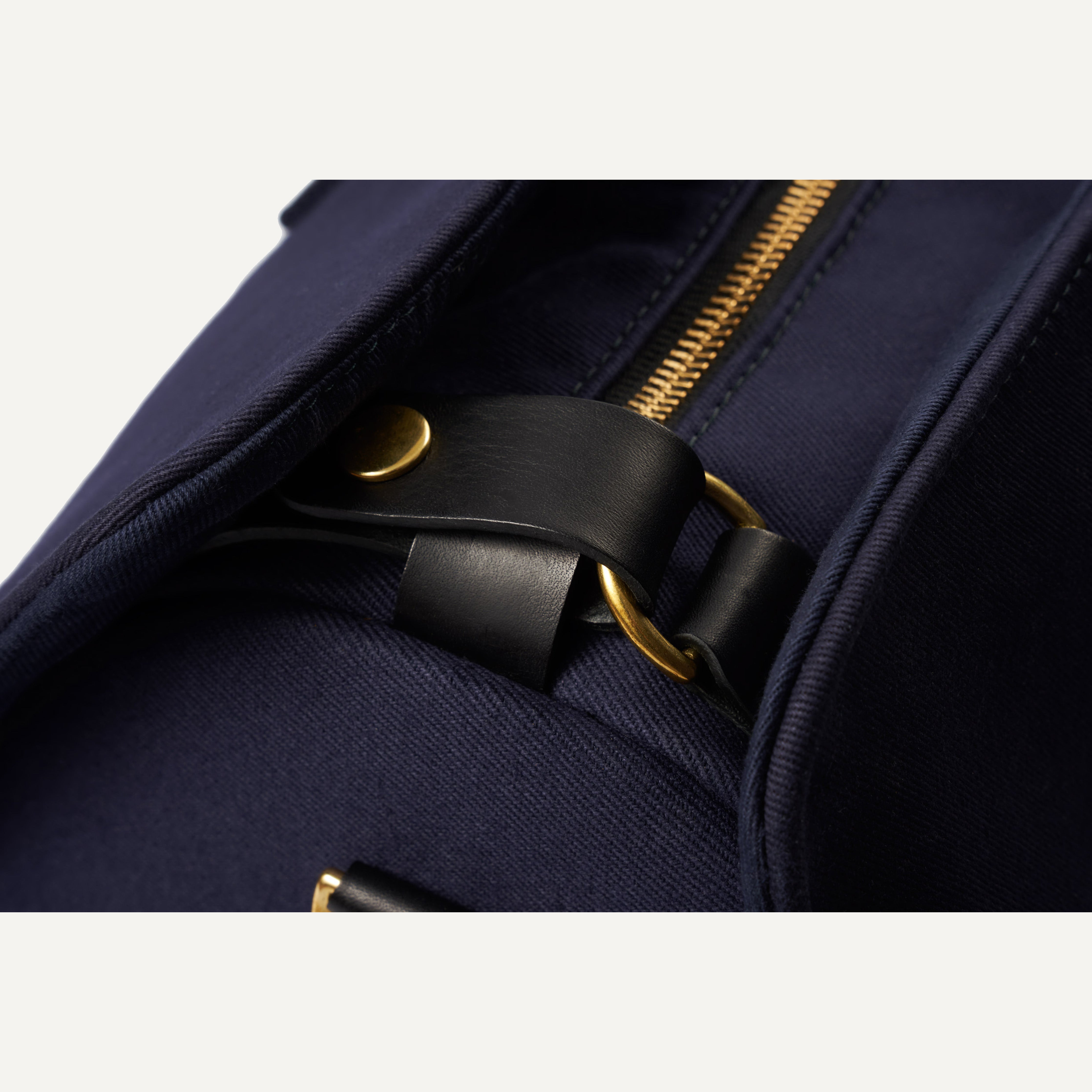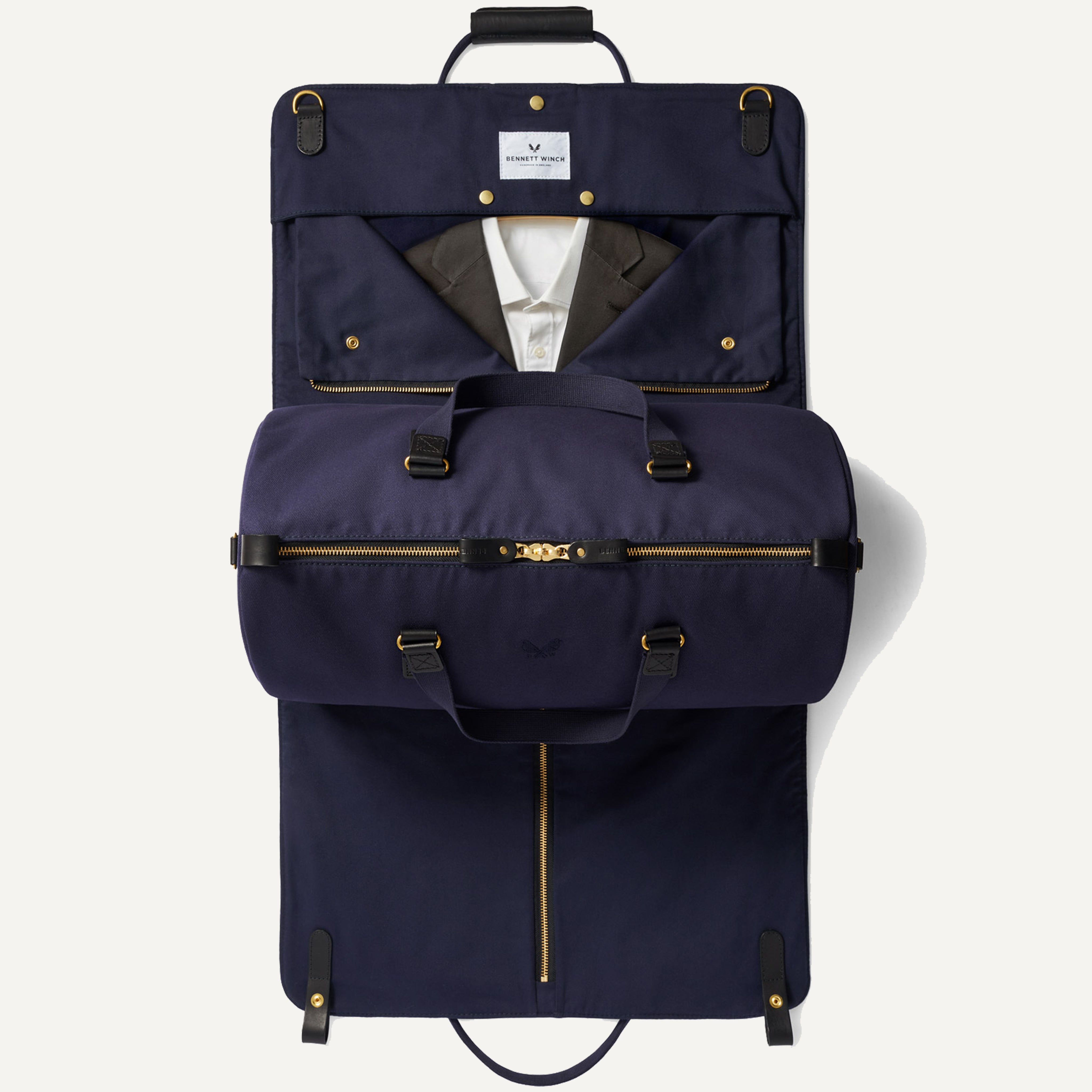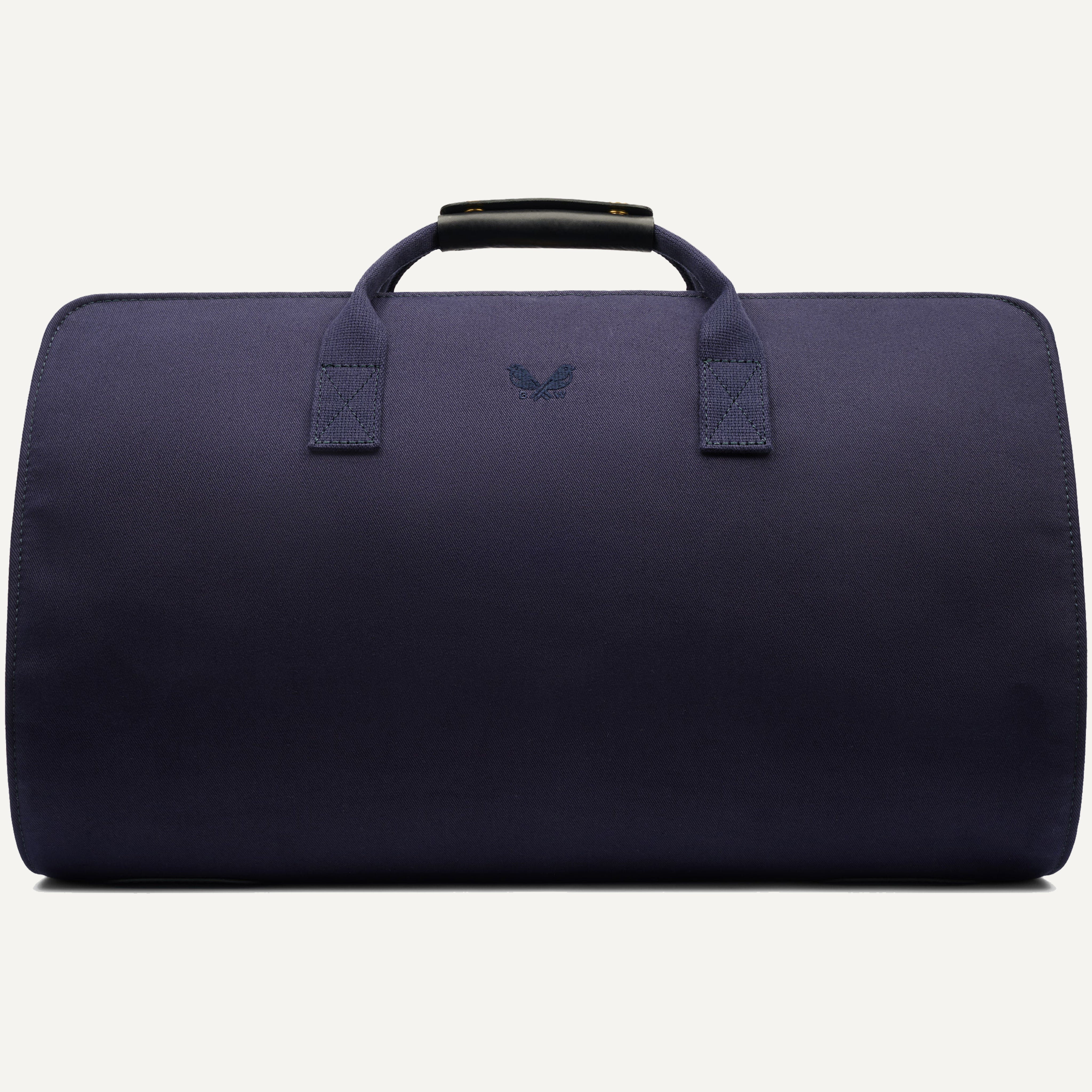 From country hotels to the meeting rooms of the world, The Navy S.C Holdall is a must for those who travel. A sharp, understated look masks a unique 2-piece design – both holdall and suit carrier in one. This construct avoids hard, tight folds by allowing a jacket and trouser to be wrapped around the spacious central cylindrical bag, which is then secured with magnets and straps. Each element can also be used separately. The S.C Holdall. Style and functionality that travels with you.