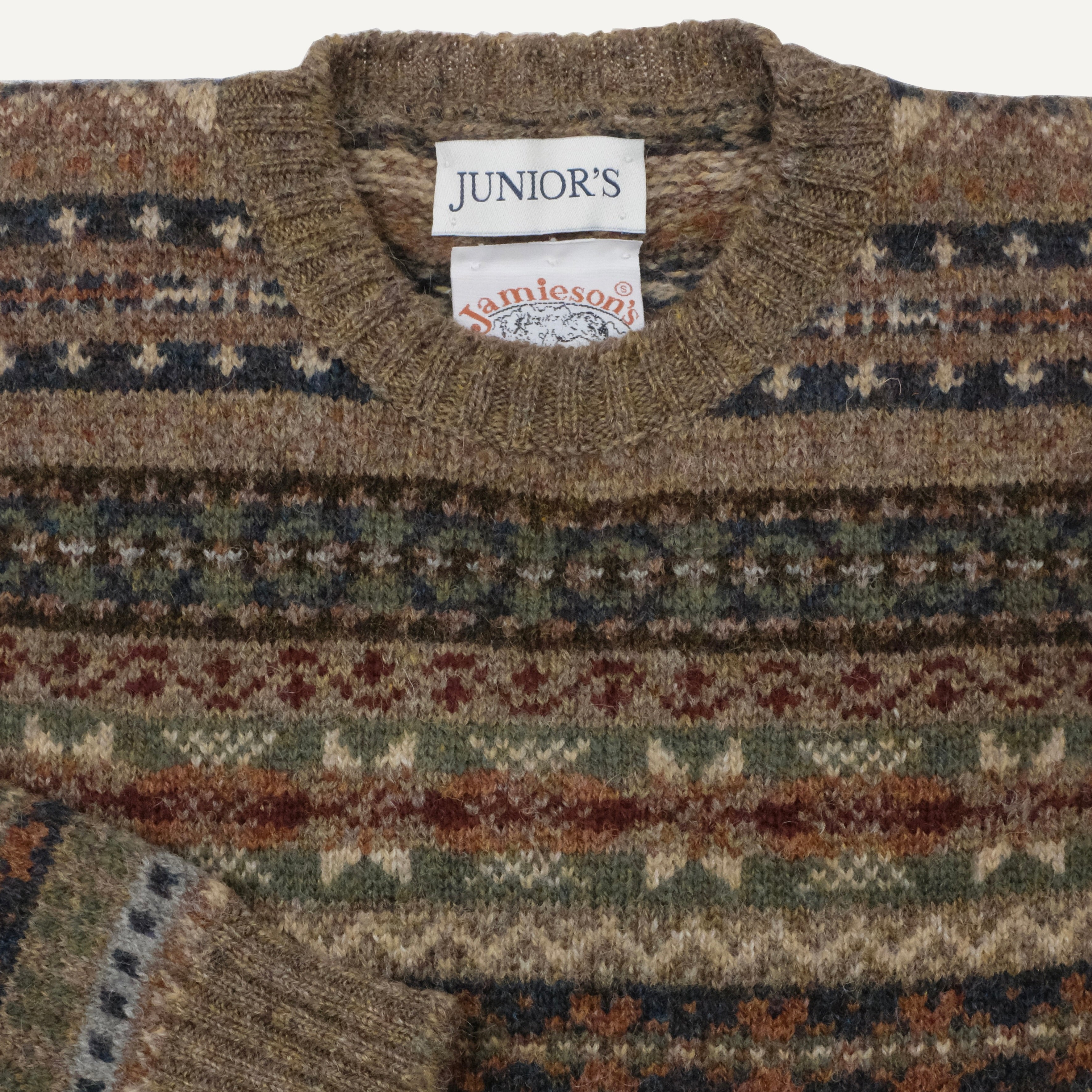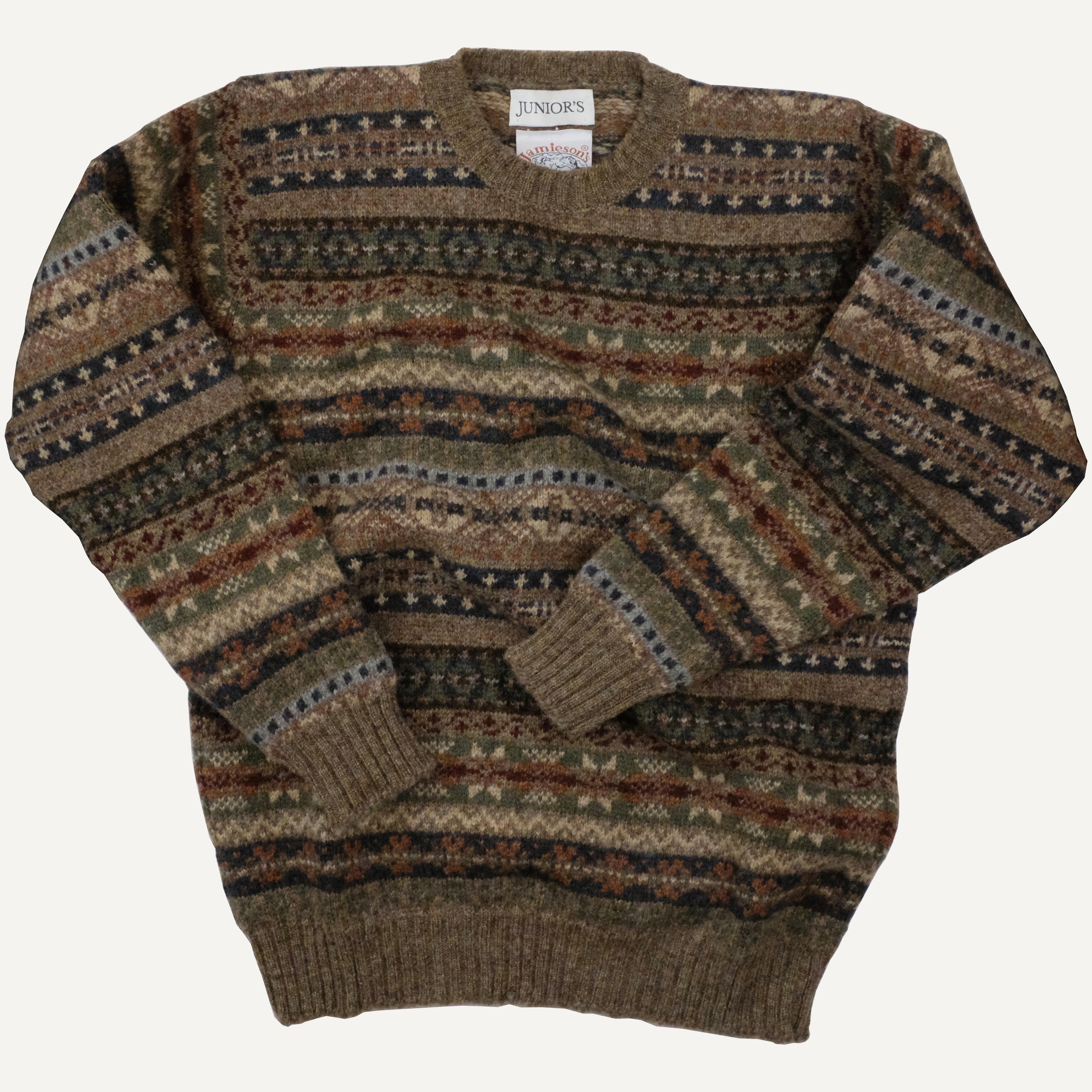 Seeking to expand the offerings in knitwear, specifically Shetland sweaters, it was an easy decision to get in touch with legendary Scottish knitwear maker, Jamieson's. This family owned knitwear maker has been a leader in the trade since the early 1890's. What makes Jamieson's a touch more special than other Scottish knitwear is that Jamieson's spins their own yarns that are then used in the making of their sweaters. To highlight this best, we teamed up with Jamieson's to produce this classic Fair Isle design in a color palette familiar to Junior's aesthetic. The simple earth tones and neutrals are easy to wear and along with the texture of Jamieson's Shetland yarns, it makes this Fair Isle a go-to item in our wardrobe from the moment temperatures dip in the Fall. Wearing a Shetland sweater is simple. Wear it over everything from a t-shirt to an oxford shirt, with chinos or jeans and under your favorite tweed sport coat or your navy blazer.