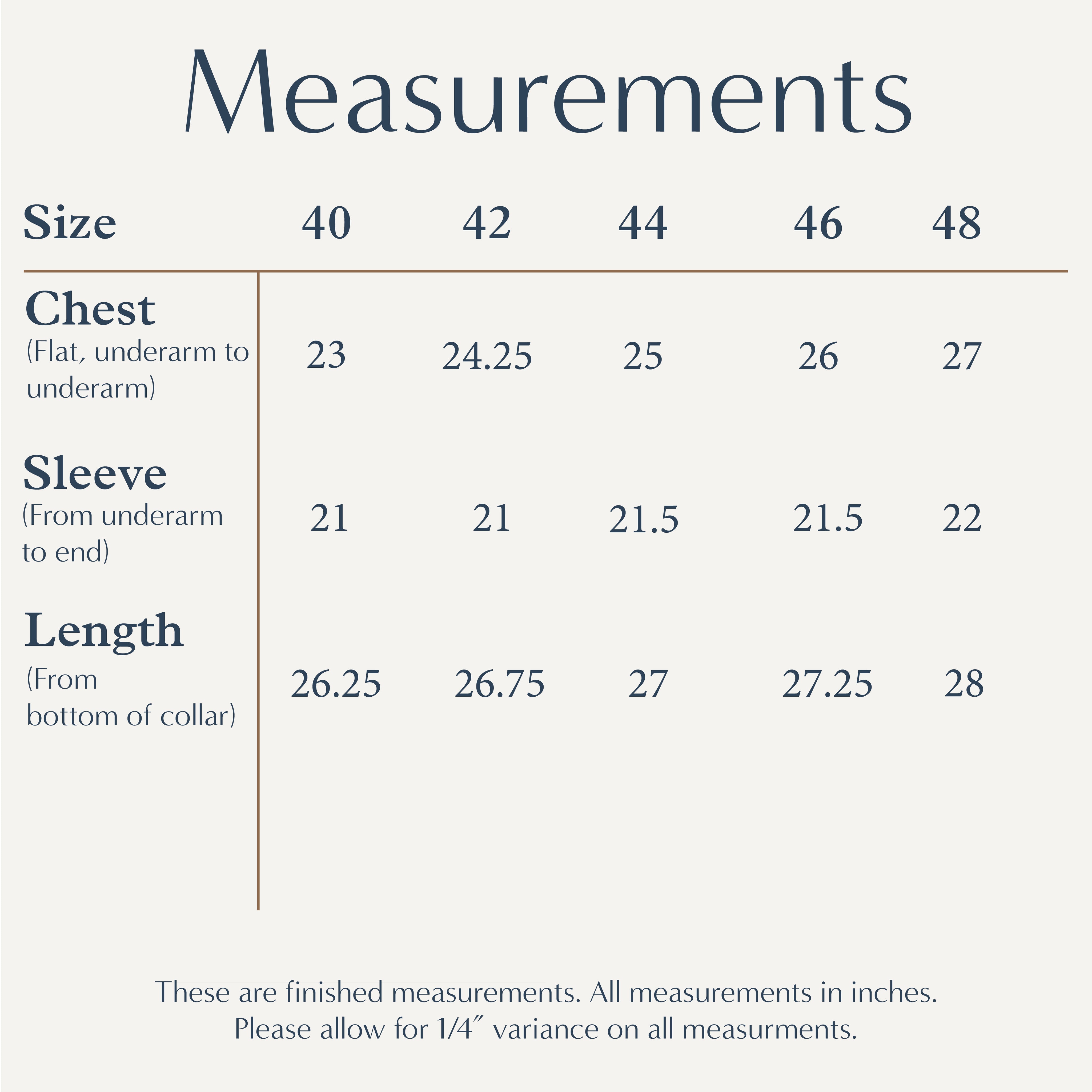 Regular Fit - We recommend taking your usual chest size. For product measurements, see the photos. For more info, send us a note here.