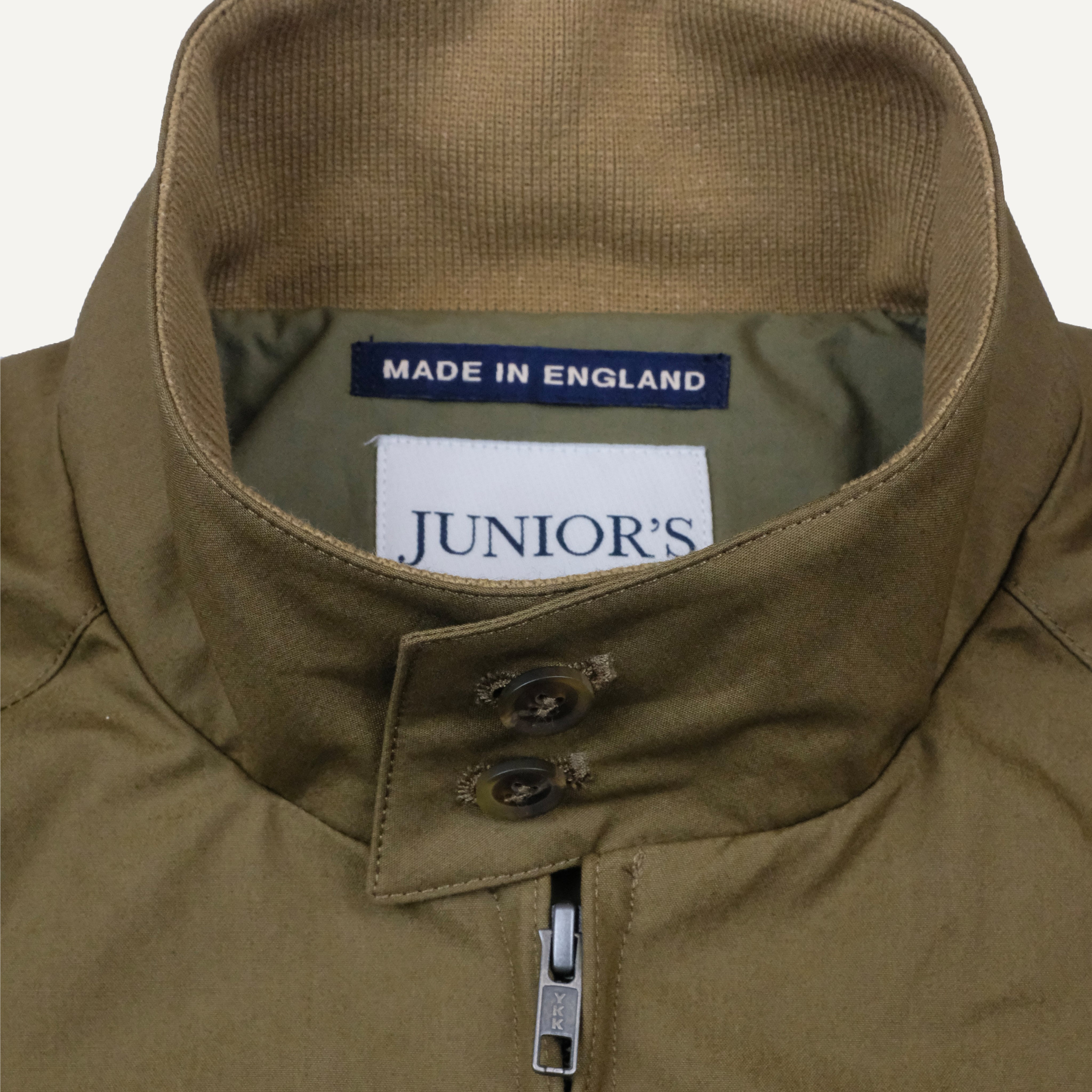 Much like our tailored clothing wardrobes, an outerwear wardrobe should have variety & versatility while still being within your comfort zone in terms of color, styling and fit. The Harrington jacket is iconic to mens outerwear but we thought it could be useful to put our own slight touch on this classic style we love. Made for Junior's in England from English-milled dry finish, water resistant, cotton the color is a versatile and easy-to-wear olive drab that will pair well with cotton trousers & denim. To us, this may be the ideal weekend or off-the-clock jacket for shoulder seasons and just beyond. With an updated silhouette for a cleaner look without losing movement, our Harrington features cotton cuffs and waistband, a YKK zipper front, flap & button pockets, funnel collar with button closure and the unmistakable umbrella back.